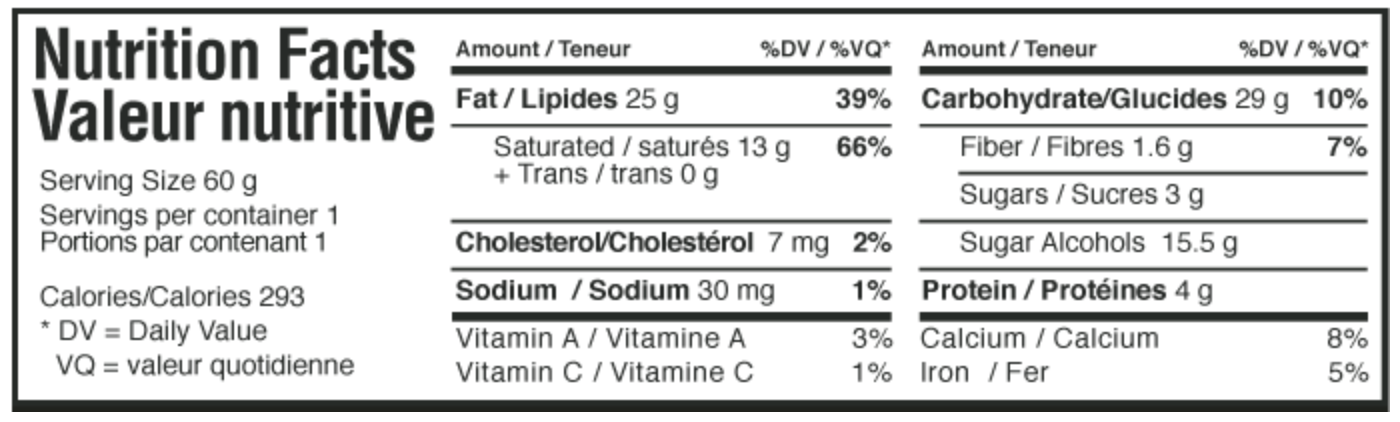 INGREDIENTS: cocoa butter, maltitol, polydextrose, whole and/or skim milk powder, cocoa mass, hazelnuts, soy lecithin, stevia leaf extract. (contains 15.5g maltitol and 7.7g polydextrose (soluble fiber) per 60g serving)
